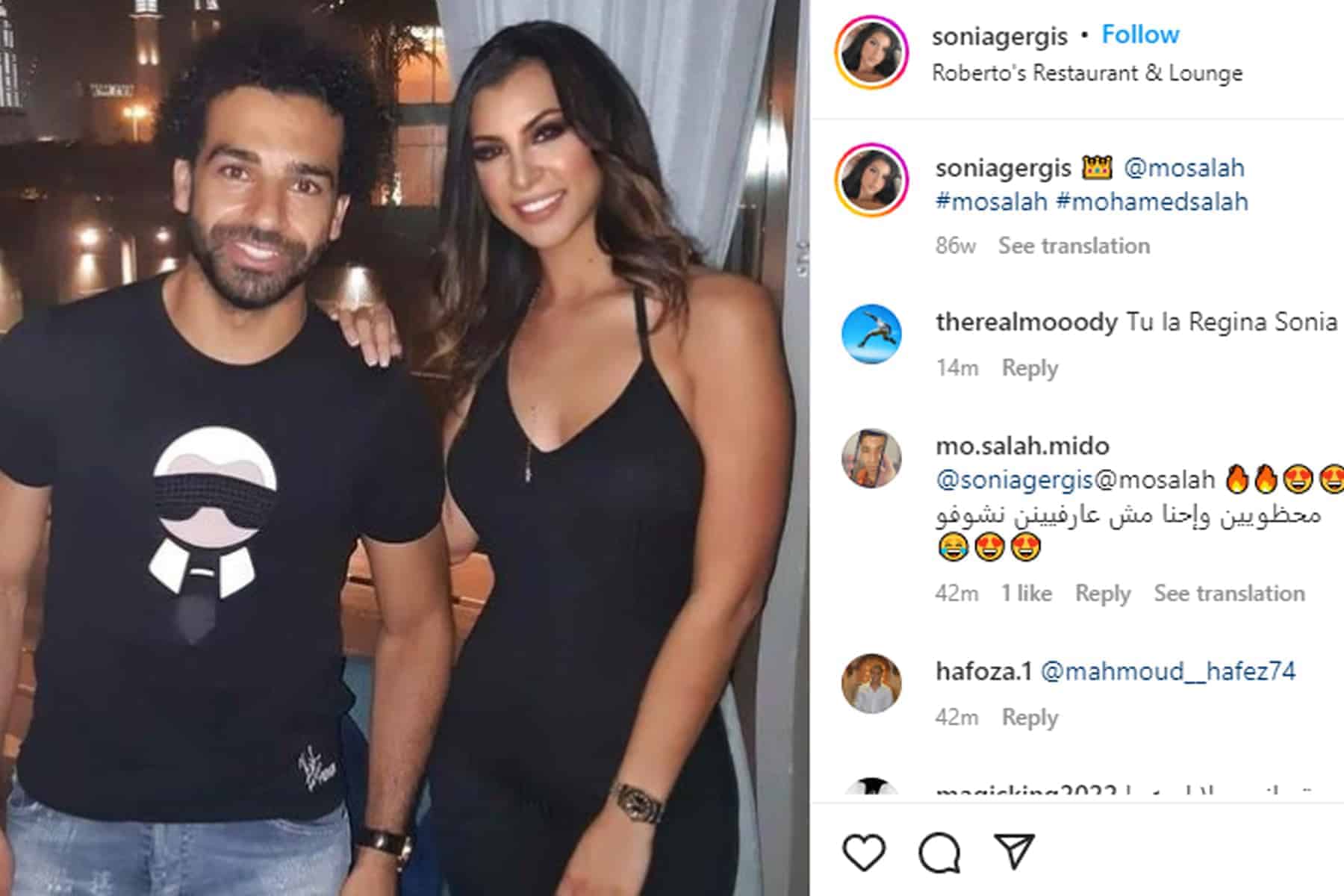 وشاركت سونيا جرجس متابعيها على منصة “انستغرام” صورتين لها برفقة اللاعب محمد صلاح، مشيرة إلى أن الصور التقطت عندما رأت نجم ليفربول الإنجليزي، أثناء قضائه إجازة سريعة في شاطئ الفندق قبل التحاقه بمعسكر منتخب مصر.