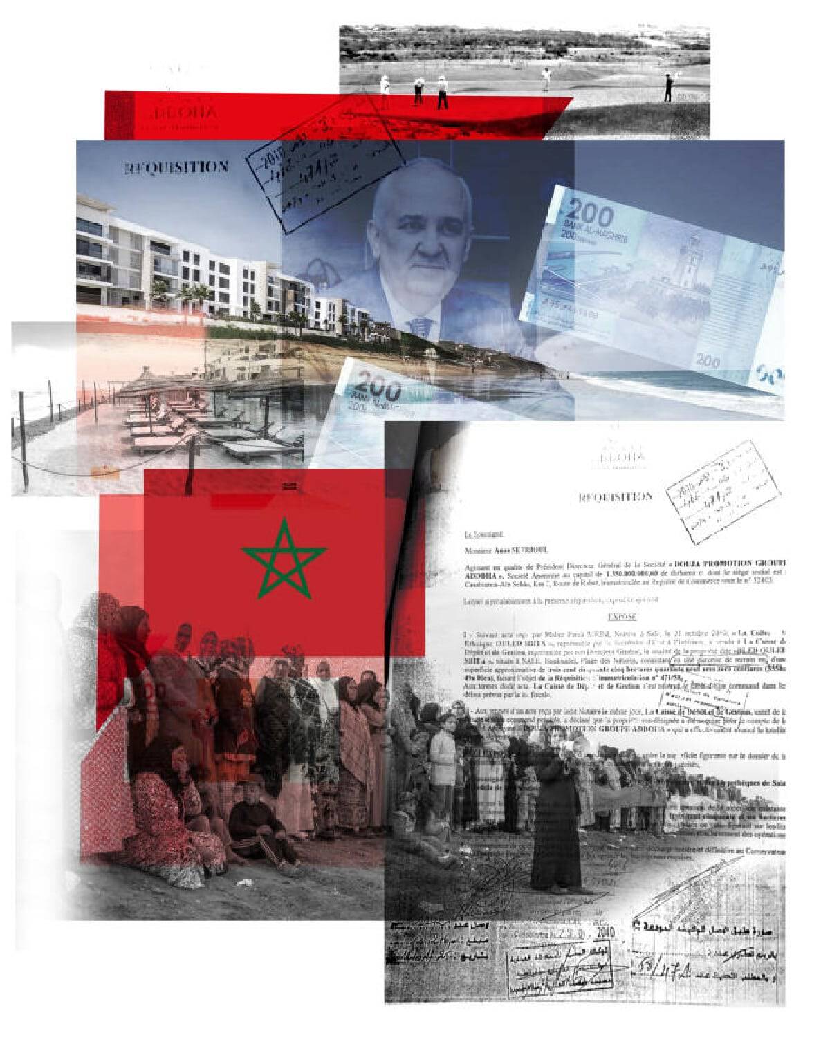 كما تم تحديد أن العقار المعني “تم الاستحواذ عليه نيابة عن الشركة العامة المحدودة Douja Promotion Groupe Addoha التي رفعت سعر البيع بالكامل بشكل فعال. بشرط عدم الكشف عن هويتها، ويؤكد لنا مسؤول تنفيذي من وزارة المالية: “لعب صندوق الإدياع والإدارة كمؤسسة عامة، دور الوسيط. وغالبًا ما يتم هذا، لأنها وسيلة لتغيير الإجراءات عبر مخطط لنزع ملكية مجتمع قبلي من أرضه”.