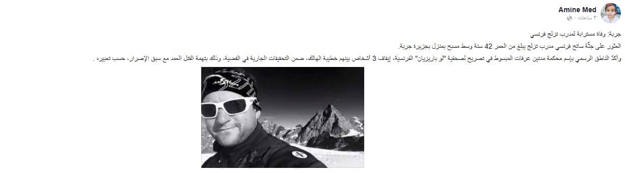 وأفادت حسابات على موقع فيسبوك، أن ” الضحية” الفرنسي هو مدرّب تزلج يبلغ من العمر 42 عاماً.