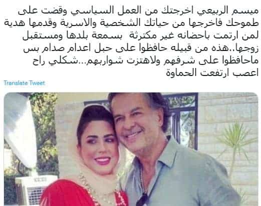 وكتب الناشط: “ميسم الربيعي اخرجتك من العمل السياسي وقضت على طموحك فأخرجها من حياتك الشخصية والاسرية. وقدمها هدية لمن ارتمت بأحضانه غير مكترثة بسمعة بلدها ومستقبل زوجها”.