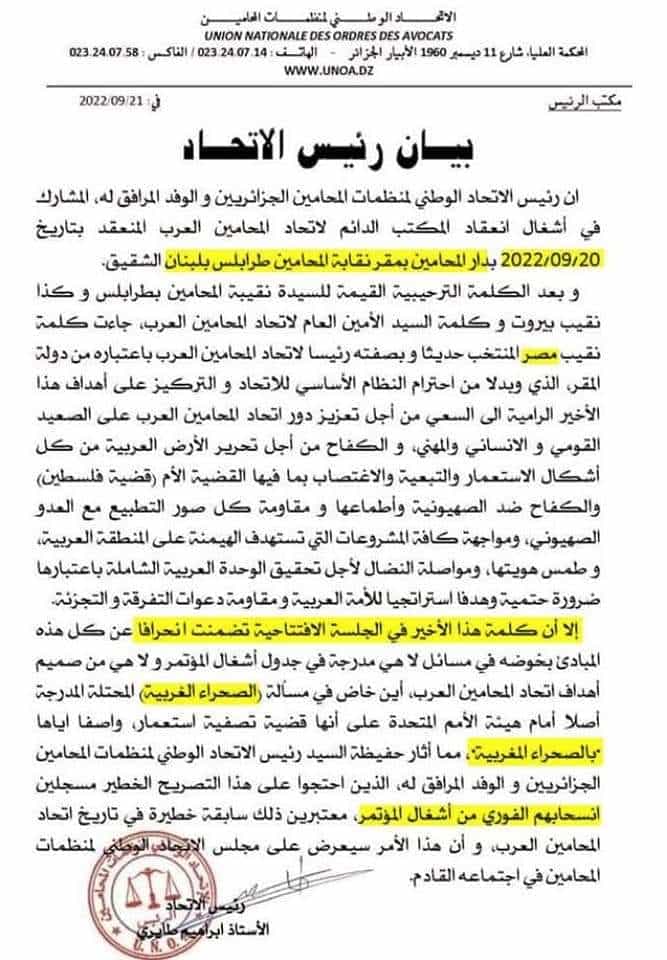 ونشر الاتحاد الجزائري، بياناً في الغرض، وقع تداوله بشكل كبير على السوشيال ميديا، قال فيه “إن كلمة الرئيس الجديد لـ”اتحاد المحامين العرب” تضمّنت انحرافاً عن كل المبادئ، بخوضه في مسائل لا هي مدرجة في جدول أشغال المؤتمر ولا هي من صميم أهداف اتحاد المحامين العرب؛ حيث “خاض في مسألة الصحراء الغربية المحتلة المدرجة أصلاً أمام هيئة الأمم المتحدة على أنها قضية تصفية استعمار، واصفا إياها “بالصحراء المغربية””.