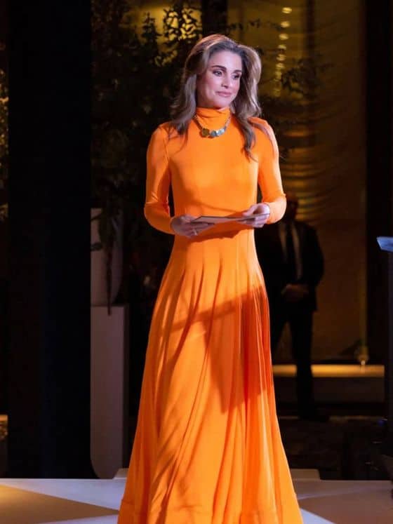 ولهذه المناسبة، اختارت رانيا، التي تعتبر معيارًا عالميًا للأناقة، ومن الناحية المنطقية أيضًا لابنتها الكبرى، فستان العرض الأول من دار الأزياء الإيطالية بوتيغا فينيتا باللون البرتقالي اللامع، والذي يتناسب تمامًا مع الموضة، حيث صمم بأكمام طويلة مع رقبة مرتفعة قليلاً، وصدر ملائم وتنورة واسعة، وهي طويلة جدًا بفضل الكشكشة في الأسفل.