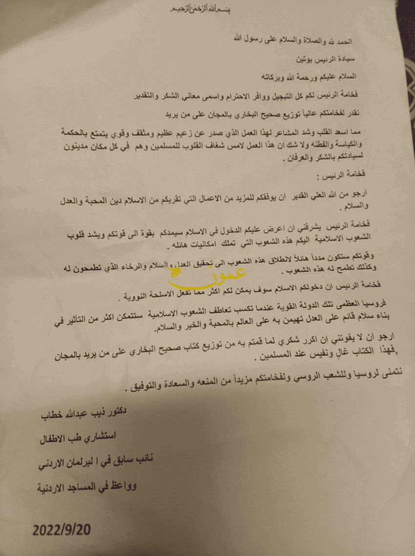 النائب الأردني الأسبق ذيب عبدالله خطاب، دعا بوتين في الرسالة المشار إليها للإسلام، وافتتحها بشكره على طبعه وتوزيعه “صحيح البخاري” بالمجان لمن يريده.