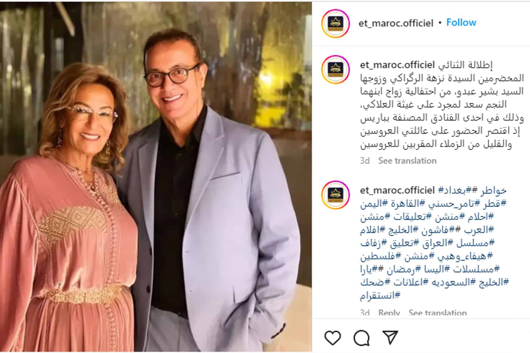 كما شاركت نزهة الرراكي والدة سعد لمجرد، عبر حسابها بإنستغرام صورة مع زوجها بشير عبدو، من حفل الزفاف في باريس.
