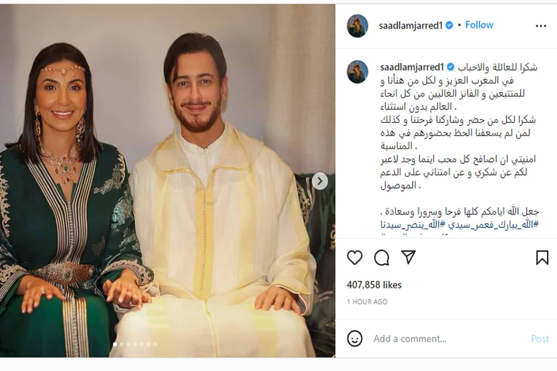 وطن- نشر الفنان المغربي سعد لمجرد، عبر حسابه الرسمي بـ”انستغرام”، صوراً لعقد قرانه على غيثة العلاكي، والتي لاقت تفاعلاً كبيراً بين النشطاء.