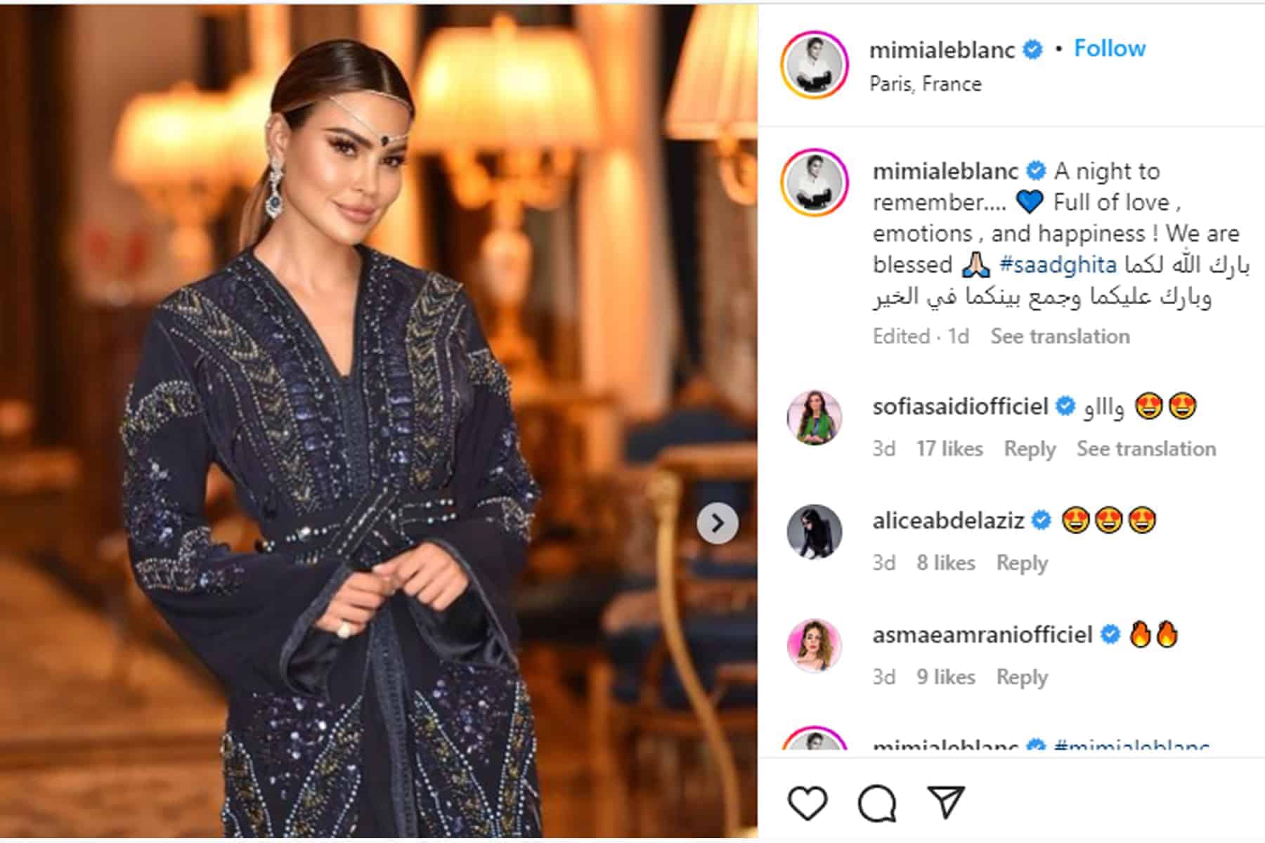وأيضا “حكمت بوجلابة” نشرت هي الأخرى صورة لها من حفل زفاف سعد لمجرد، واعتمدت فيها ارتداء القفطان المغربي.