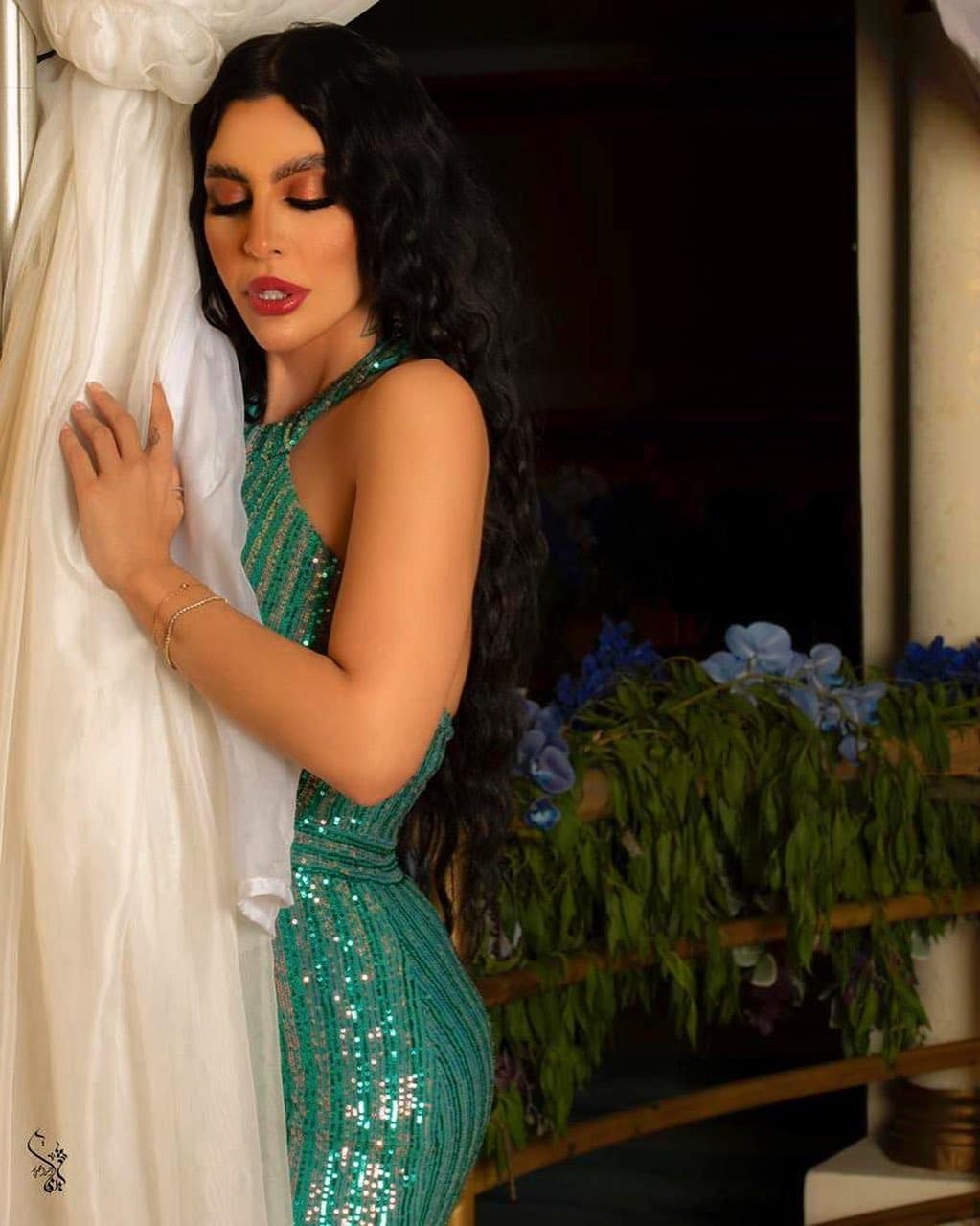 وارتدت ليلى إسكندر فستاناً فاضحاً بلون العلم السعودي الأخضر الغامق، كشف الكثير من صدرها وساقيها.