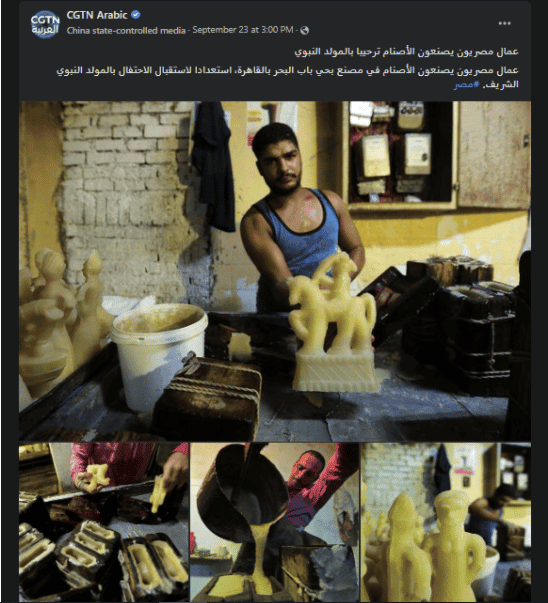 وقال حساب التلفزيون الصيني تعليقاً على الصور التي وثقت عملية صناعة عرائس الحلوى الشهيرة في مصر: “عمال مصريون يصنعون الأصنام في مصنع بحي باب البحر بالقاهرة، استعداداً لاستقبال الاحتفال بالمولد النبوي الشريف”.