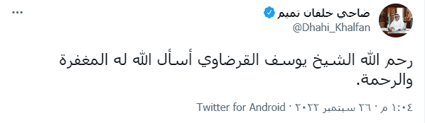 وقال “خلفان” في تدوينة له عبر حسابه بموقع التدوين المصغّر “تويتر”، رصدتها “وطن“: “رحم الله الشيخ يوسف القرضاوي”، وأضاف “أسأل الله له المغفرة والرحمة”.