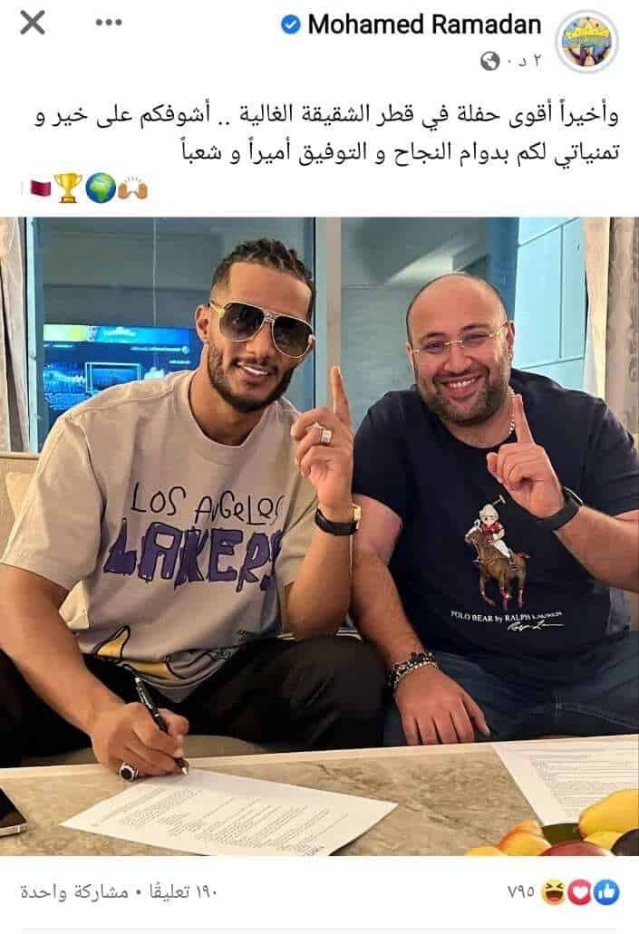 وكتب محمد رمضان منشوراً قال فيه: “وأخيرًا أقوى حفلة في قطر الشقيقة الغالية.. أشوفكم على خير وتمنياتي لكم بدوام النجاح والتوفيق أميرًا وشعبًا”.