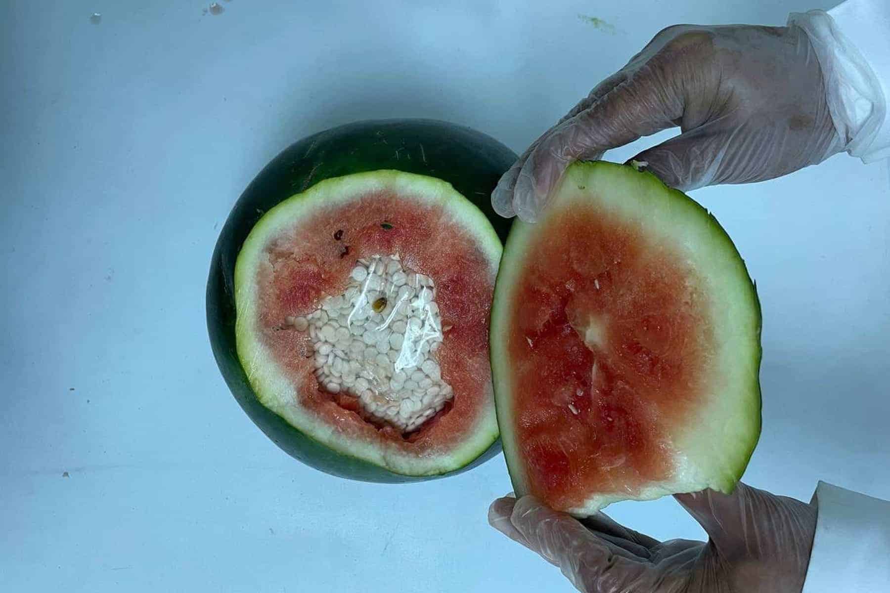 وكانت كل بطيخة تحتوي على كيس شفاف مغلق، به كمية كبيرة من حبوب الإمفيتامين المخدرة.
