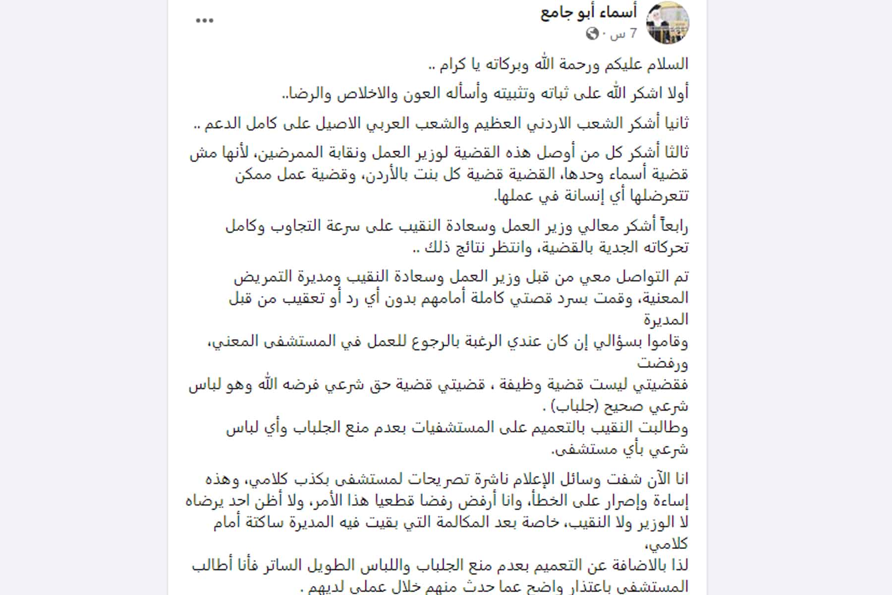 جدير بالذكر، أنه في تحديث للواقعة، كتبت الممرضة الأردنية منشوراً جديداً عبر صفحتها الشخصية على موقع فيسبوك، أوضحت خلاله تطورات حدثت على قضيتها.