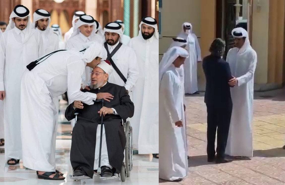 أمير قطر يعزي في وفاة الشيخ يوسف القرضاوي (يمين) ويقبل رأسه (يسارا) - أرشيف