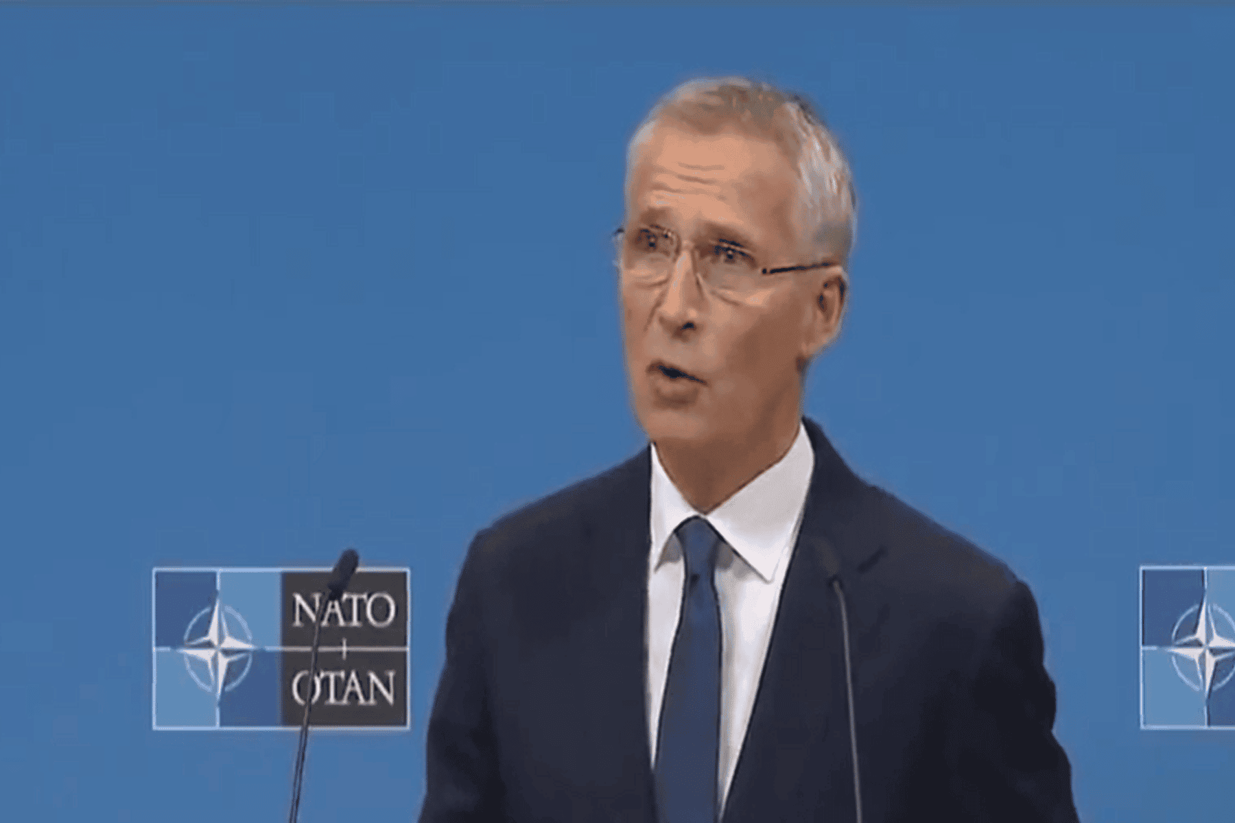 وظهر ستولنبرغ وهو يلقي خطاباً، بينما تغيّر البثّ فجأة لـ يظهر بوتين وهو يلقي خطابه المنتظر في الساحة الحمراء وسط موسكو.