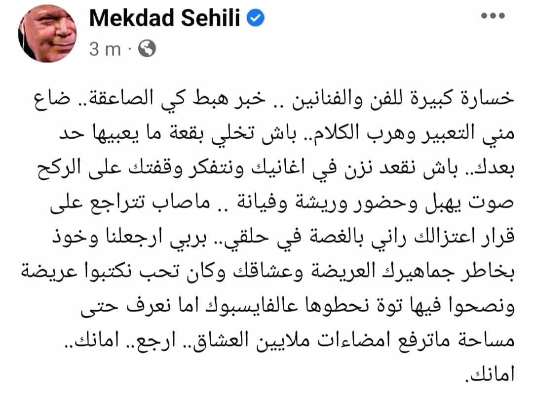 وتابع ساخراً: “باش تخلي بقعة ما يعبيها حد بعدك.. باش نقعد نزن في اغانيك ونتفكر وقفتك على الركح صوت يهبل وحضور وريشة وفيانة .. ماصاب تتراجع على قرار اعتزالك راني بالغصة في حلقي”.