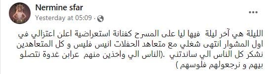 وتابعت: “اعلن اعتزالي في اول المشوار انتهى شغلي مع متعاهد الحفلات انيس فليس و كل المتعاهدين نشكر كل الناس الي ساندتني”.