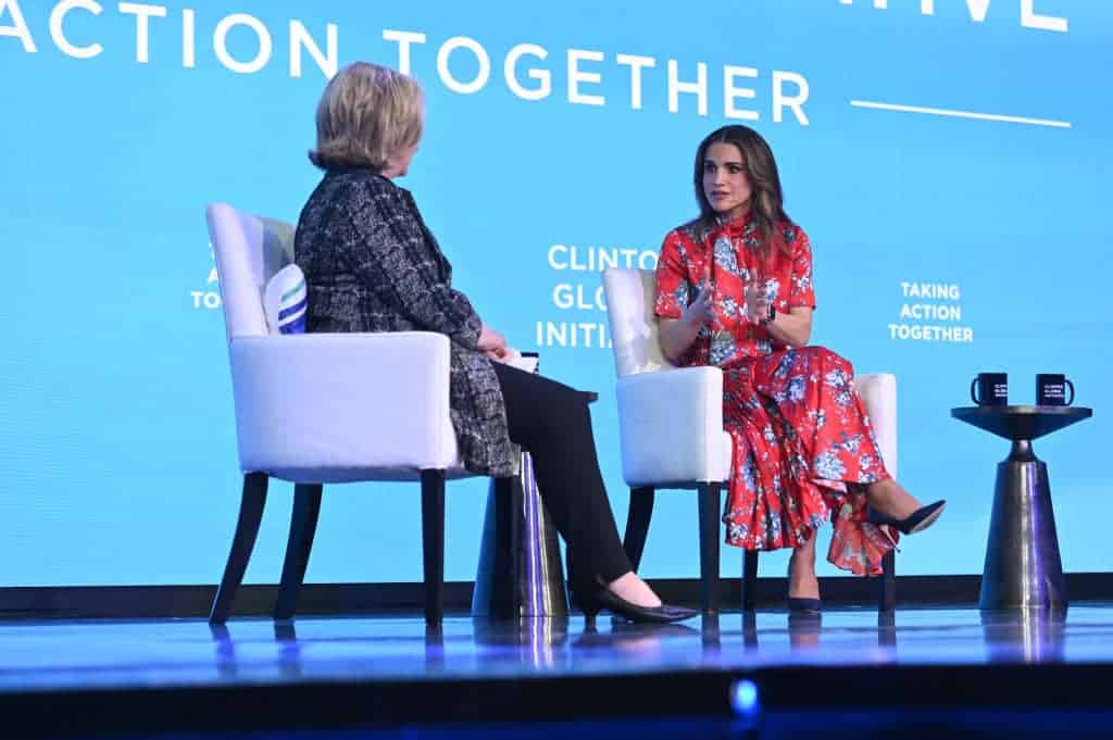 في الأسبوع الماضي، ارتدت ملكة الأردن أحذية جنيفر شمندي ثلاثَ مرات في المناسبات العامة، في اجتماع مبادرة كلينتون العالمية في 20 سبتمبر في نيويورك، كانت ترتدي تنورة وقميصاً أحمر منقوشاً بالأزهار من Erdem والأزهار الكحلية وحذاء أزرق كحلي بنفس لون الأزهار من جيفنيفر شمندي.