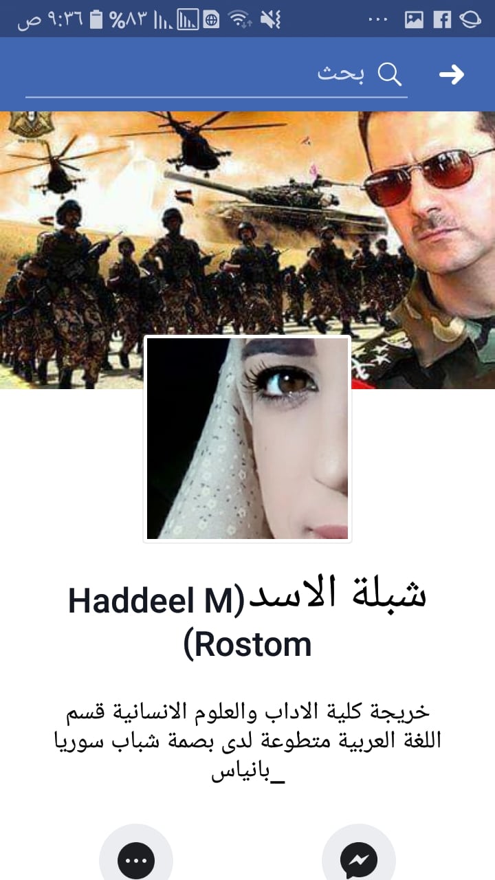 وزيادةً في التمويه، ألغت صفحتها السابقة التي كانت تسمى “شبلة الأسد” إلى جانب اسمها باللغة الإنكليزية، وتضم صوراً من تشبيحها وثنائها على قادة ما يسمى بالدفاع المدني في طرطوس، وصورة لها وهي تقف على قبر معلمها السابق “علي شدود”.