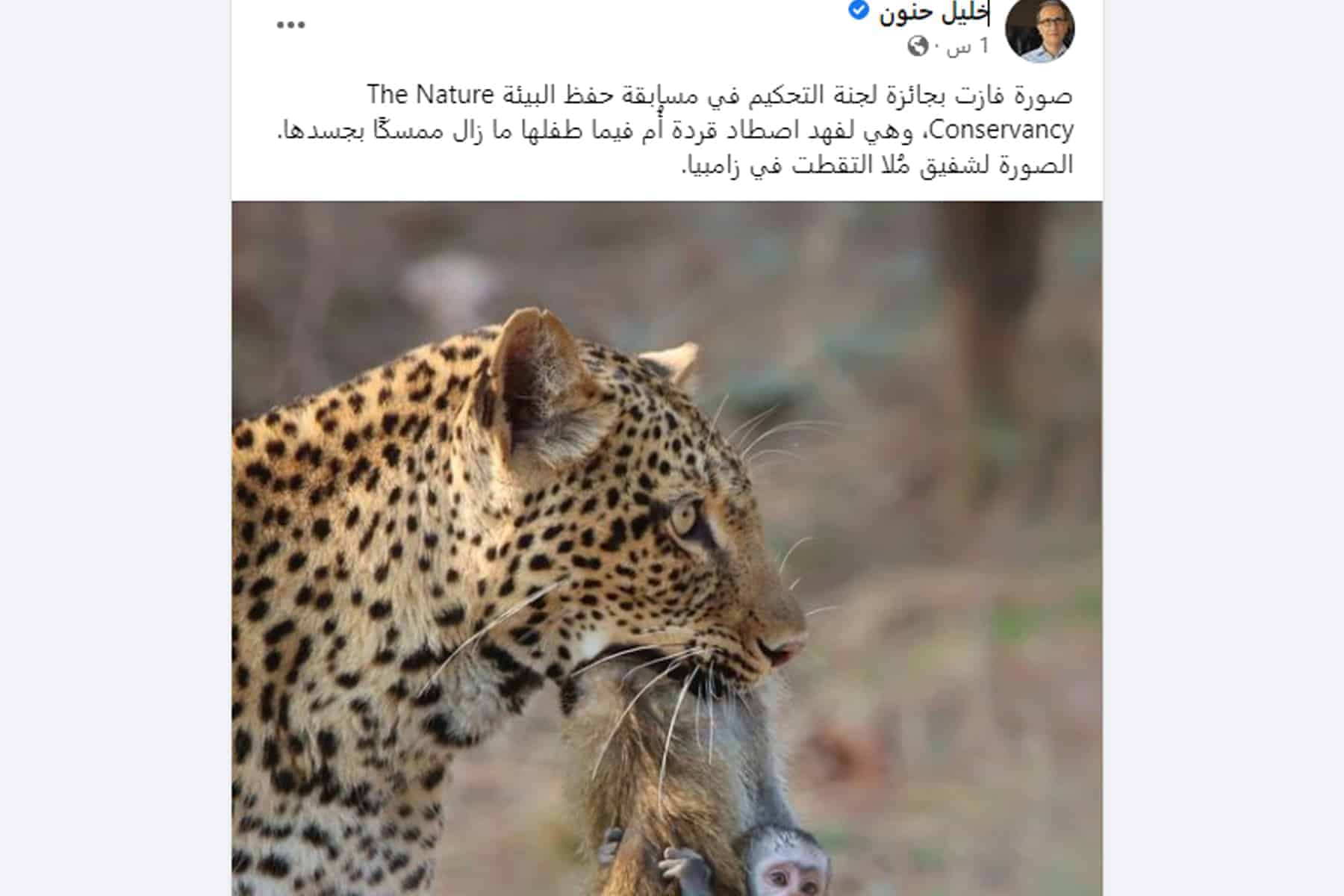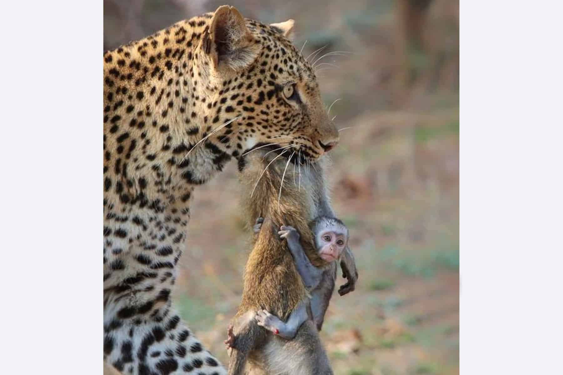 وفي معرِض تعليقها على صورة ملا، قالت المنظمة: “مملكة غير مهجورة النمر المعروف باسم أوليمبا يحمل جثة أنثى قرد vervet مع طفلها الذي لا يزال معلقًا.. التقطت الصورة في حديقة جنوب لوانغوا الوطنية في زامبيا”.