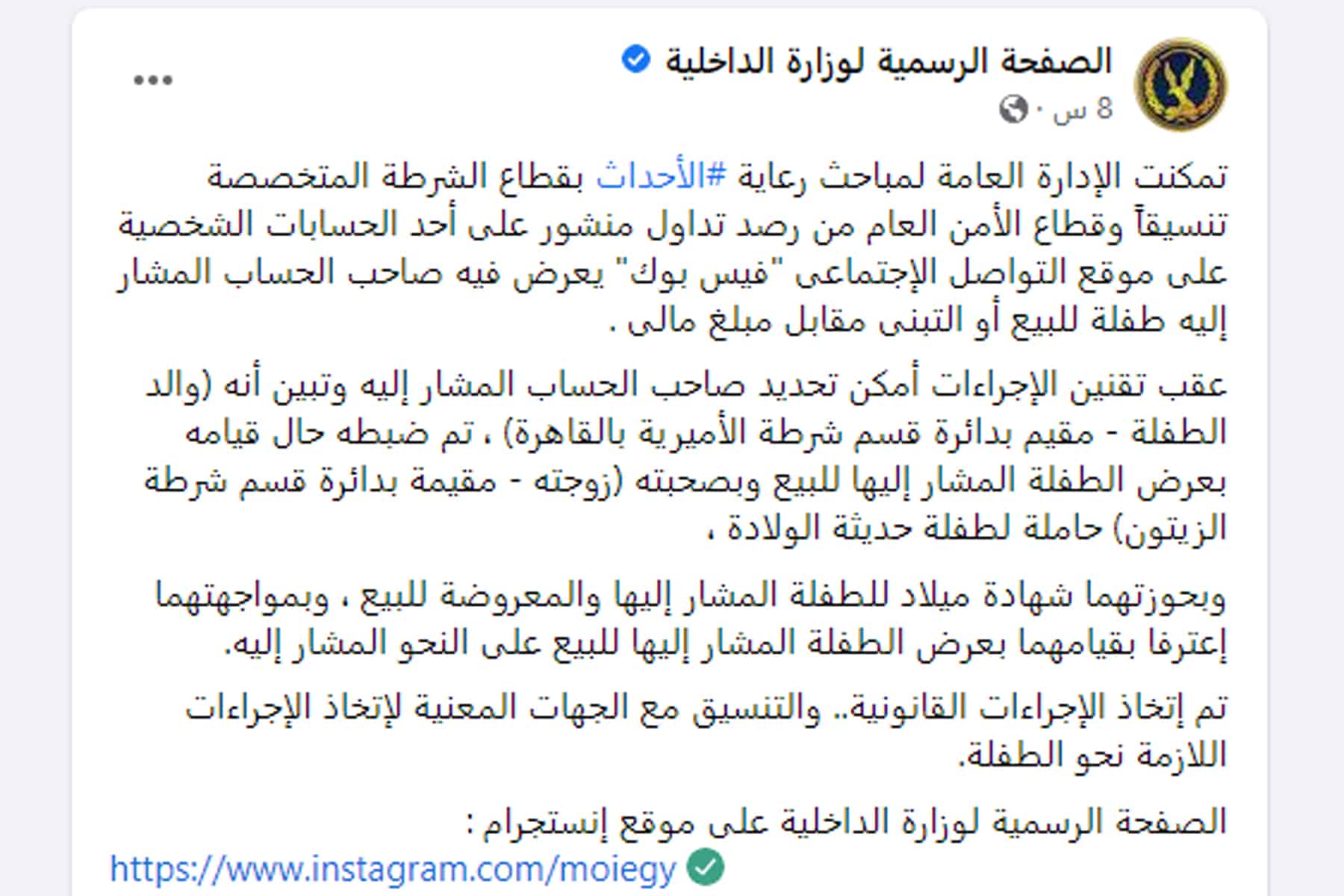 وبخصوص منشور آخر كان قد راج على مواقع التواصل، ويعرض فيه أب مصري طفلته للبيع، كشفت وزارة الداخلية أن الإدارة العامة لمباحث رعاية الأحداث، تمكّنت من رصد تداول منشور على “فيس بوك” يعرض فيه صاحب الحساب المشار إليه طفلةً للبيع أو التبني مقابل مبلغ مالي.