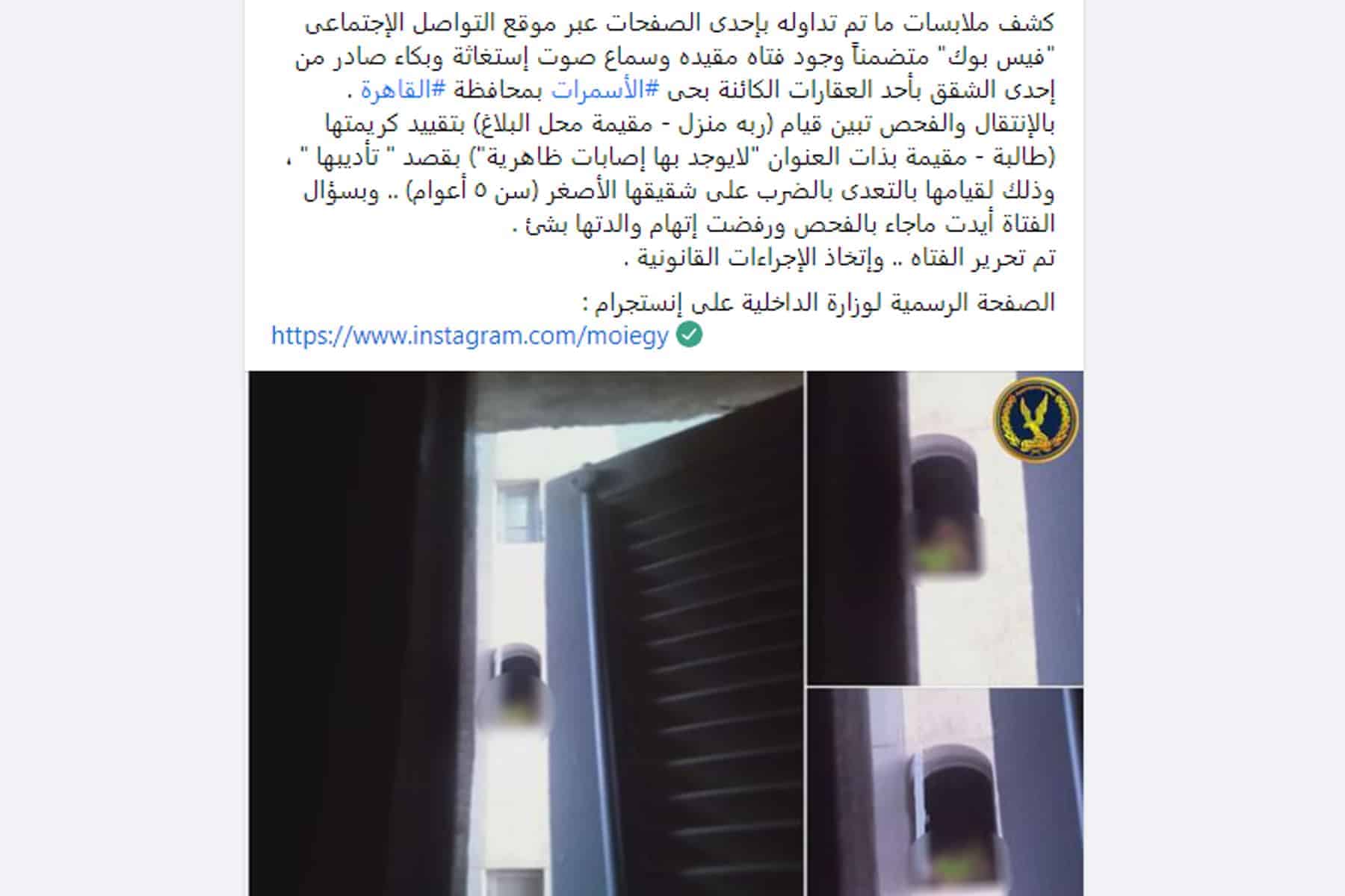 وعن الواقعة الأولى، فقد كشفت الداخلية ملابسات ما تمّ تداوله بإحدى الصفحات عبر موقع التواصل الاجتماعى “فيس بوك” متضمّناً وجودَ فتاة مقيدة، “وسماع صوت استغاثة وبكاء صادر من إحدى الشقق بأحد العقارات الكائنة بحي “الأسمرات” بمحافظة القاهرة.