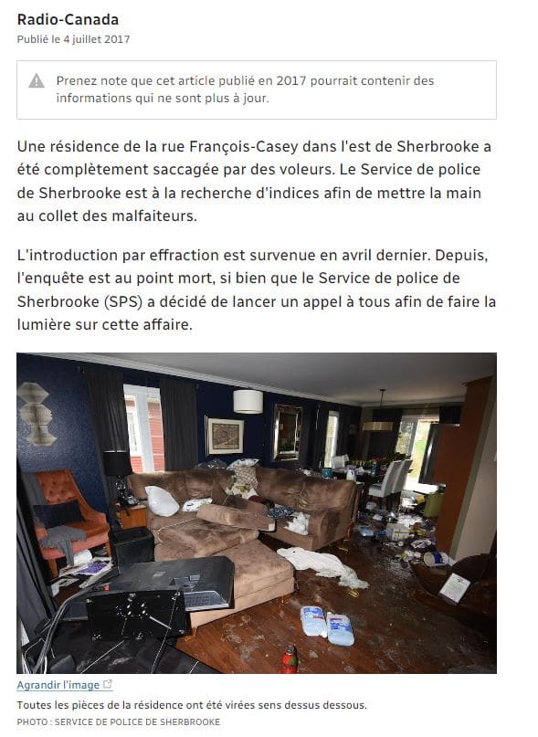 وأشارت المواقع الكندية، ومن ضِمنها موقع “آي سي آي راديو” أنّ الحادث وقعَ في مدينة شيربروك في جنوب مقاطعة كيبك الكندية، حيث تعرّض المنزل للسرقة، في حين بلغَت تكلفة الممتلكات التي تمّت سرقتها ما يقارب من 130 ألف دولار.