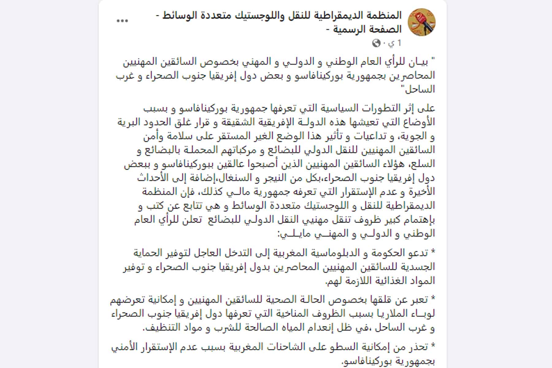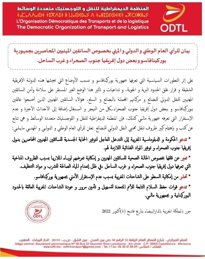 ونشرت المنظمة الديمقراطية للنقل واللوجستيك متعددة الوسائط في المغرب بياناً في الغرض، أمس الأول من أكتوبر، أكدت فيه على “الوضع الصعب للسائقين المغاربة بعد التطورات السياسية الأخيرة في بوركينا فاسو”.