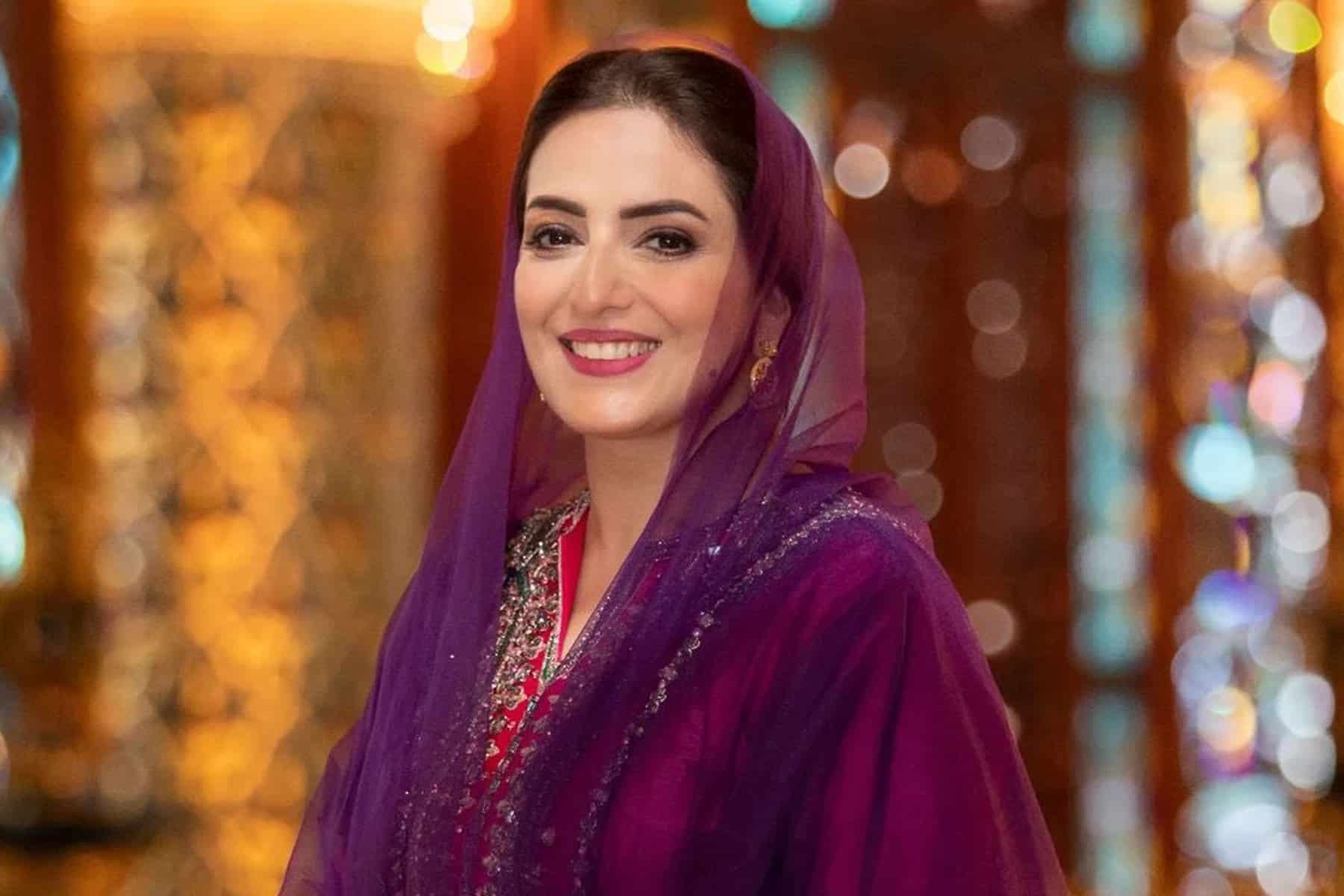 وظهرت “البوسعيدية” بعباءة بيضاء، تحتها رداء باللون السماوي وعلى رأسها غطاء رأس شفاف.