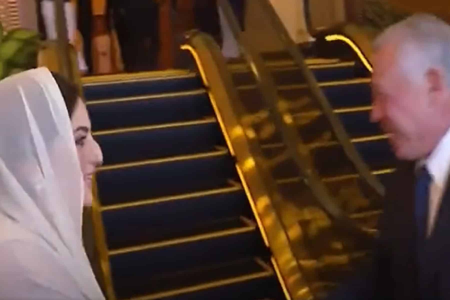 ومدّت عهد البوسعيدي يدَها لمصافحة العاهل الأردني، الذي يبدو أنَه لم يلتفت في البداية، وعند انتباهه أسرع بمدّ يده ومبادلة السيدة عهد المصافحة بحرارة وعبارات الترحيب.