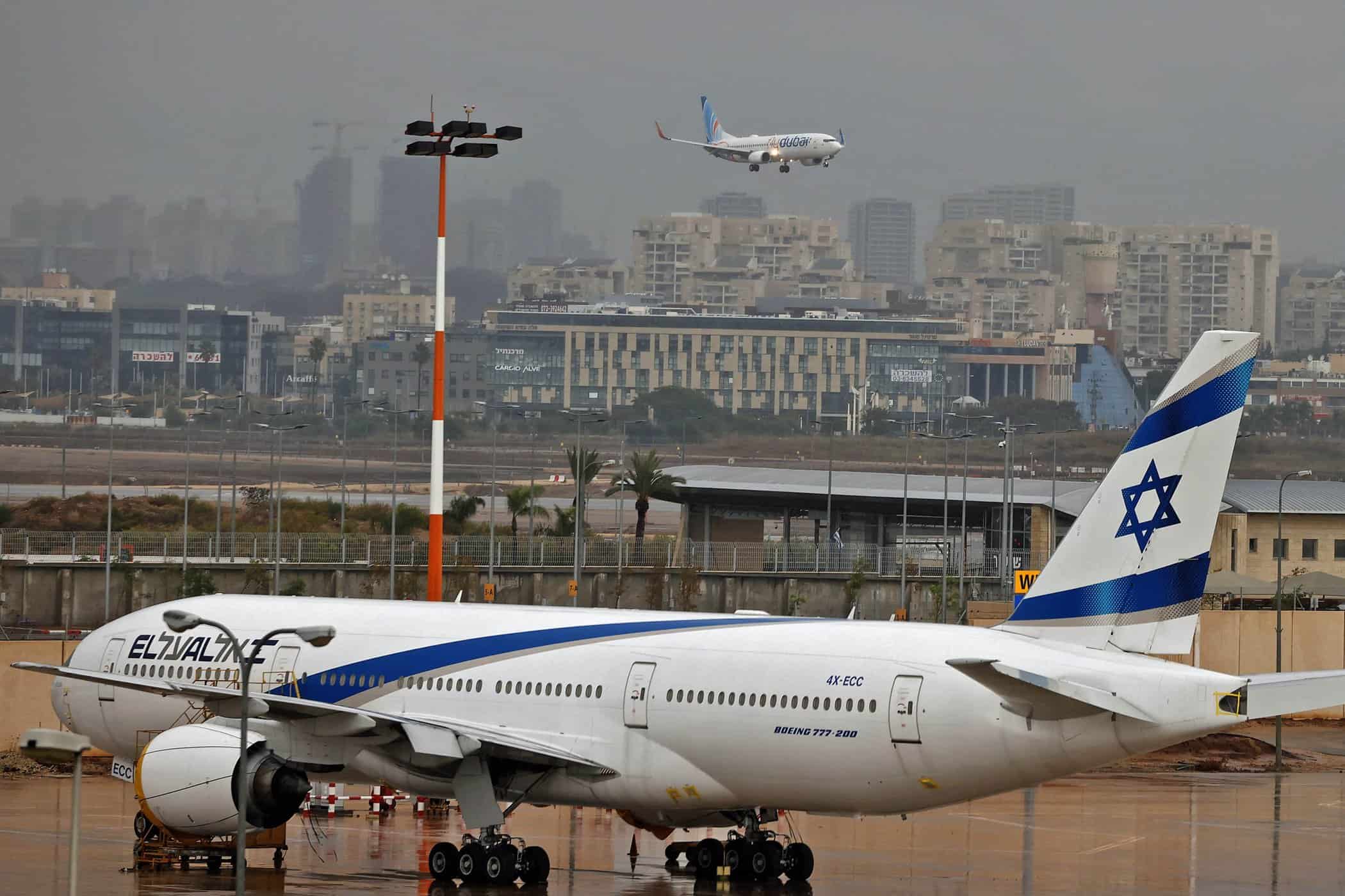 An airplane of budget airline flydubai lands at Israel's Ben Gurion aiport near Tel Aviv on November 26, 2020 on the first scheduled commercial service between the two cities, following the normalisation of ties between the UAE and Israel. (Photo by JACK GUEZ / AFP)