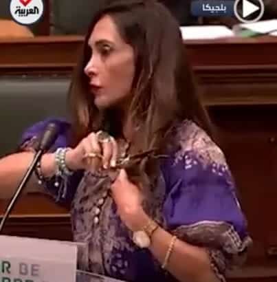 والوزيرة البلجيكيّة الناطقة بالفرنسية والمنحدرة من عائلة جزائرية، أمسكت بمقص وقامت بهذه المبادرة لتحذو بذلك حذو نائبة معارضة من أصل إيراني تجلس بجانبها خلال جلسة مساءلة للحكومة في المجلس.