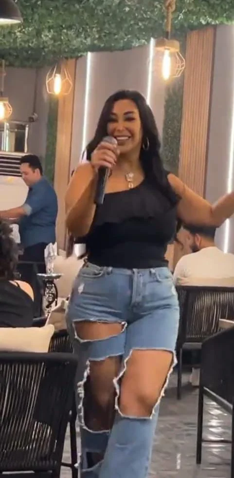 وارتدت شاهيناز بنطال جينز ممزق بشكل فاضح، يكشف فخذها بشكل كامل. مع توب أسود بدون أكمام.