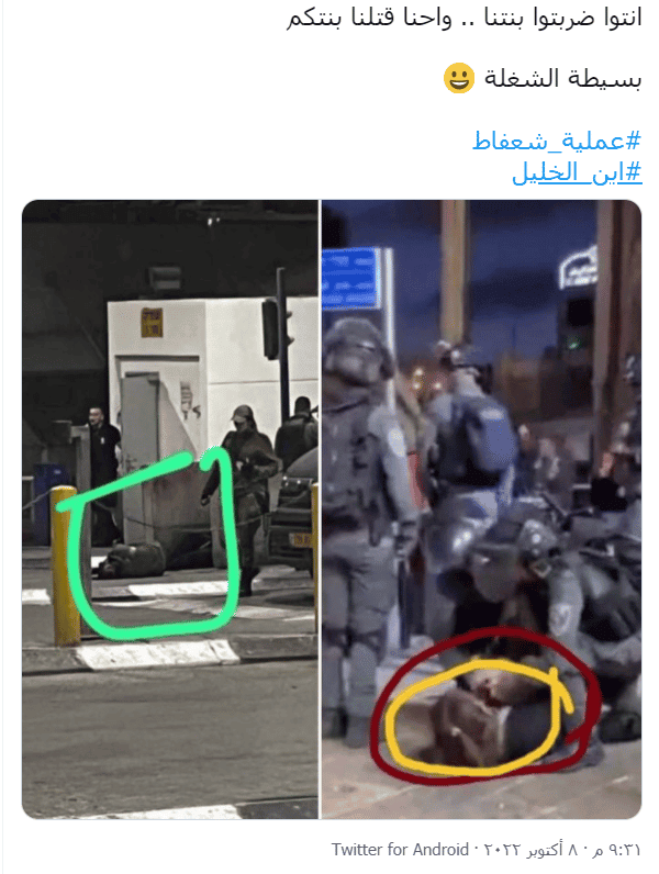 ناشط آخر غرّد بصورة مركبة للاعتداء على الفتاة الفلسطينية اليوم، مع صورة لمجندة إسرائيلية منهارة وتبكي عقب العملية.
