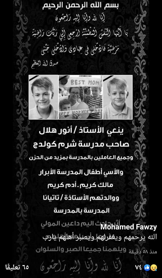 وعلقت مدرسة “شرم كولدج” لافتةً كبيرة لنعي الطفلين والأم المعلمة بالمدرسة، وسط حزن كبير خيّم على المعلمين وإدارة المدرسة والطلبة على حد سواء.
