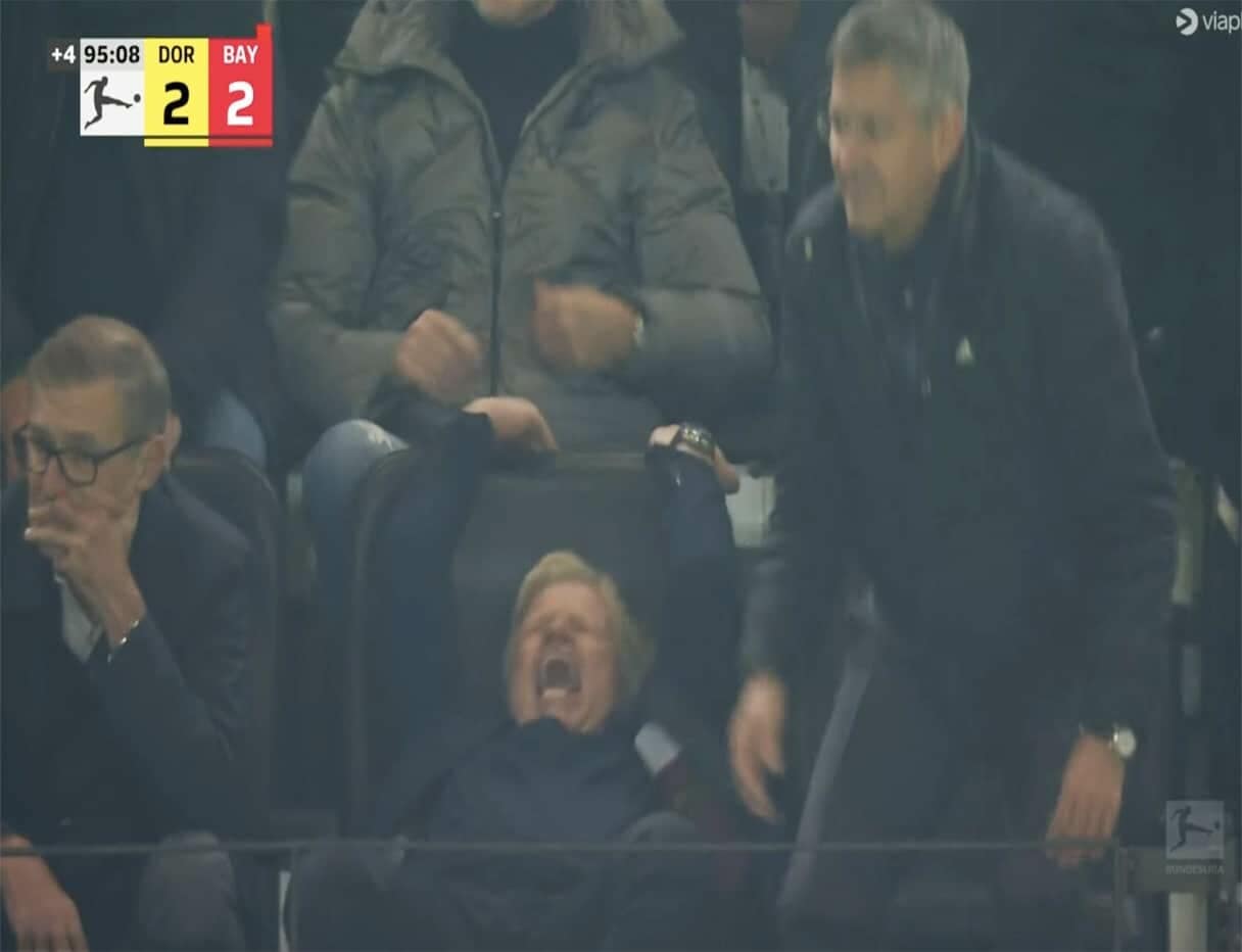 وظهر في مقطع الفيديو المتداوَل عبر منصات التواصل الاجتماعي، غضبُ أوليفر كان عملاق الحراسة الألمانية والرئيس التنفيدي لبايرن ميونخ، بعد نجاح بوروسيا دورتموند من إحراز هدف التعادل الثاني داخل شباك البافاري، في الوقت القاتل على نهاية المباراة.