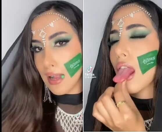 ووفقاً للفيديو المتداوَل الذي رصدته “وطن“، فقد قامت الفتاة برسم علم السعودية على خدِّها الأيمن، في حين قامت برسم العلم السعودي على لسانها الذي وضعت فيه حلق.