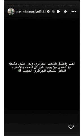 وكتبت عبر حسابها على إنستغرام: “أحب وأعشق الشعب الجزائري… ولكن عندي مشكلة مع الفندق ولا يوجد غير كل المحبة والاحترام الكامل للشعب الجزائري الحبيب”.