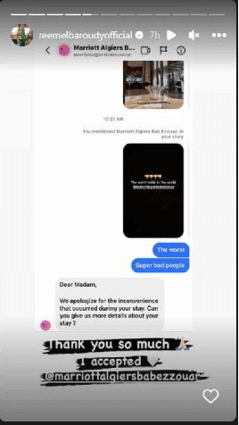 وعبرت الفنانة المصرية إلى متابعيها عبر حسابها على منصة انستغرام عن بالغ استيائها من سوء معاملة إدارة الفندق الذي نزلت فيه في الجزائر.