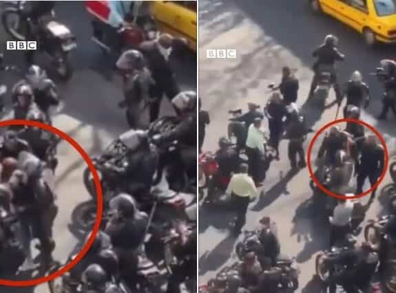 This video making the rounds on Twitter appears to show an Iranian riot police officer groping a woman as he and others try to force her on a motorcycle to ride pillion. The date and location are unclear.pic.twitter.com/2XUrViQlU7
