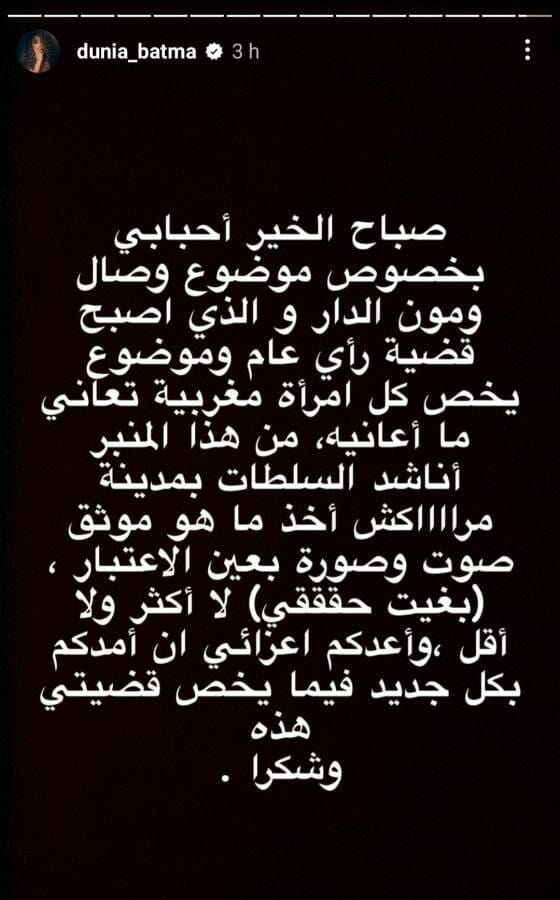 وأضافت بطمة: “أحبابي بخصوص موضوع وصال وبيتي الذي أصبح قضية رأي عام وموضوع يخص كل امرأة مغربية تعاني ما أعانيه. من هذا المنبر أناشد السلطات بمدينة مراكش أخذ ما هو موثق صوت وصورة بعين الاعتبار. أريد حقي لا أكثر ولا أقل وأعدكم أن أمدّكم بكل جديد في ما يخص قضيتي هذه”.
