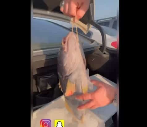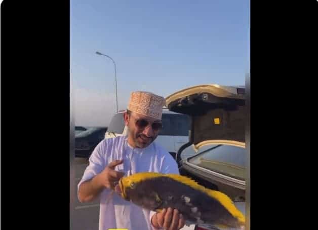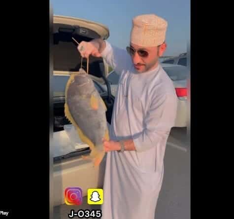 وظهر “البلوشي” في المقطع المتداول وهو يستعرض سمكته (الذهبية)، ويتحدث عن مواصفاتها النادرة وسعرها.