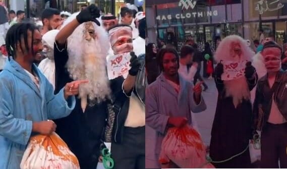 حيث ظهر مجموعة شبان سعوديون يتنكرون بأزياء زومبي ومصاصي دماء، قاموا بحمل لافتة كُتب عليها “نحبك شيرين”.
