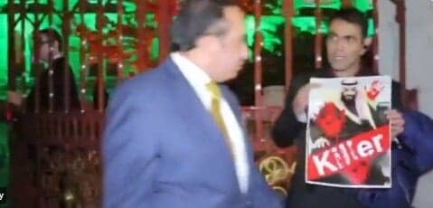 ووقف “الدوسري” أمام مقر السفارة، وهو يحمل صورة ولي العهد السعودي الأمير محمد بن سلمان، وهي مُلطّخة بالدماء، وكتب عليها كلمة (قاتل) بالإنجليزية.