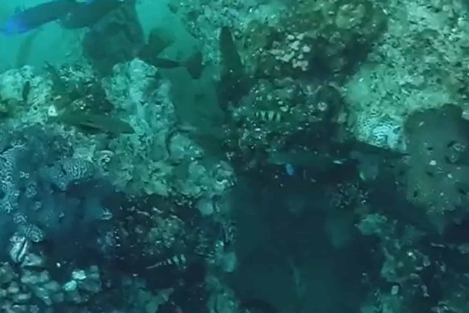 وخلال ثوان كانت السمكة الضخمة، التي يبدو أنها استشعرت الخطر، قد اختفت عن الأنظار داخل الصخور الشعاب المرجانية.