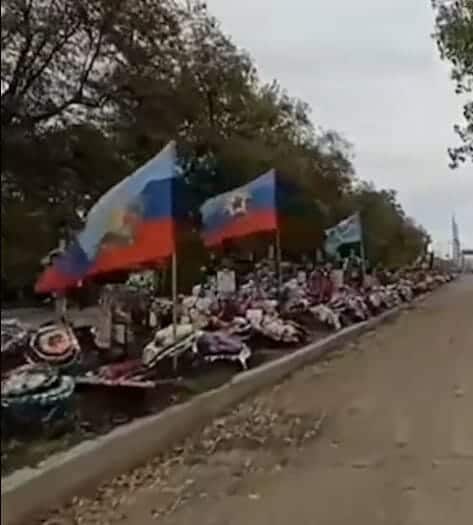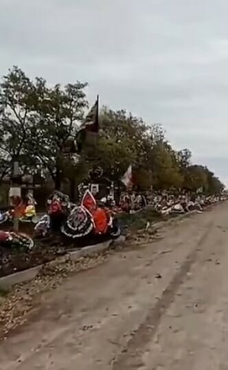 وبحسب الفيديو، فقد ظهر على امتداد الطريق الطويل شواهد قبور الجنود الروس المزعومة، في حين حملت بعض هذه الشواهد في أعلاها العلمَ الروسي، والبعض الآخر حمل صورة الجندي المدفون.