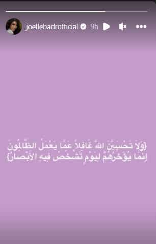 وما زاد الشكوك، أنّ جويل نشرت عبر خاصية الستوري على حسابها في “انستجرام” أيةً قرآنية: “ولا تحسبن الله غافلا عما يعمل الظالمون ۚ إنما يؤخرهم ليوم تشخص فيه الأبصار”.