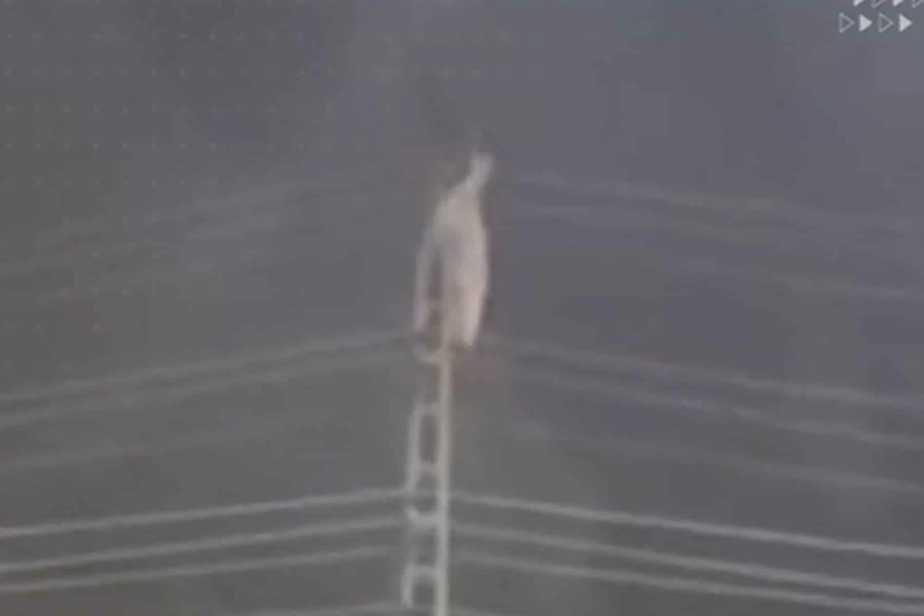 وظهر الشخص وهو يرتقي عموداً حديدياً شاهق الارتفاع، وسط عدد من الأشخاص، حيث وقفوا يراقبونه.