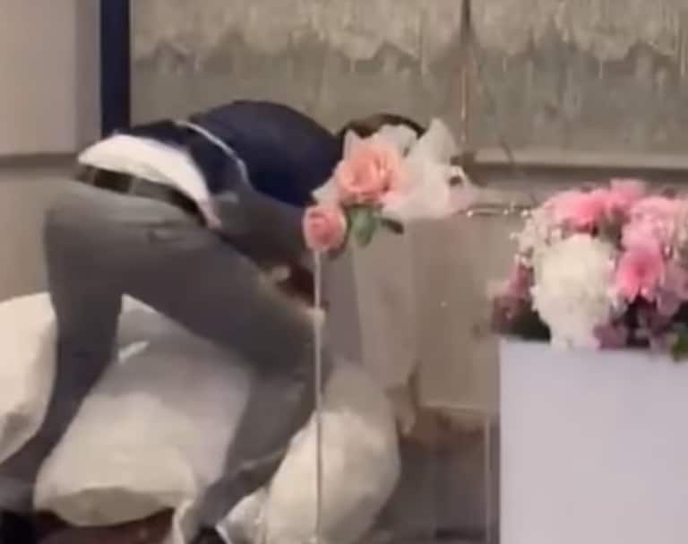 ويظهر المقطع، لحظةَ توجّه العريس إلى “كعكة الزفاف” المكونة من أربع طبقات، ليأخذ منها قطعة، ويتوجّه بها إلى العروس، ويفاجئها بأن قام بتلطيخها وفركها في وجهها.