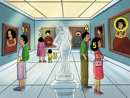 إذا نظرت إلى الصورة بعناية، فستتمكن من تحديد العدد الإجمالي للأشخاص داخل معرض اللوحة. لو كنت تعتقد أن الإجابة هي 11، فهذا خطأ لأن اللوحة والتمثال ليسا على قيد الحياة.
