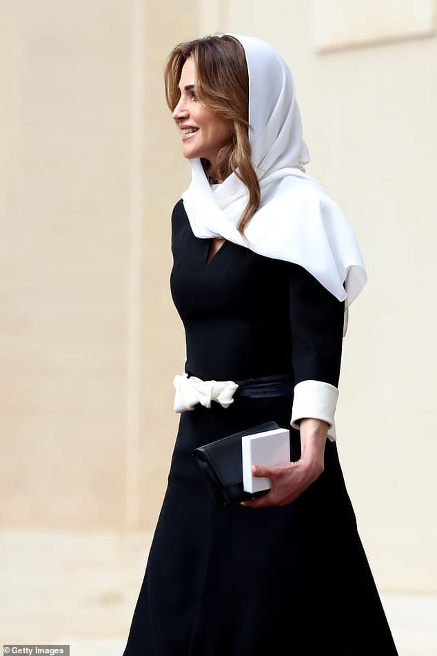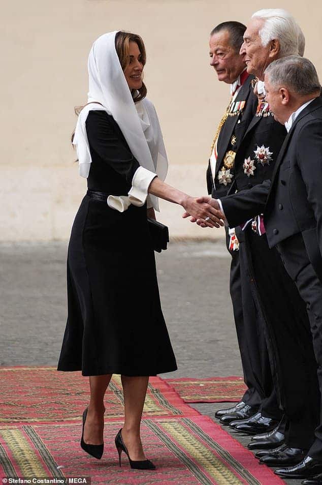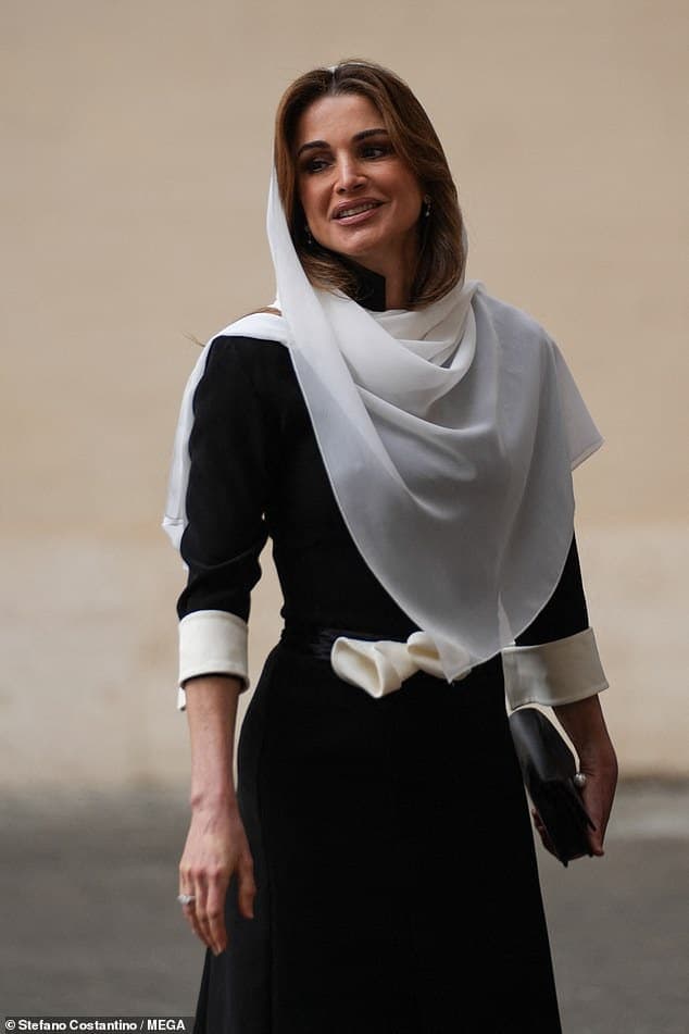 بدت الملكة الفاتنة، البالغة من العمر 52 عاماً، أنيقةً جداً بفستان أسود تميّز بحزام أبيض حول خصرها، وأطراف أكمام بيضاء أيضاً، وذلك أثناء ظهورها للجمهور مع البابا فرانسيس وزوجها في القصر الرسولي.